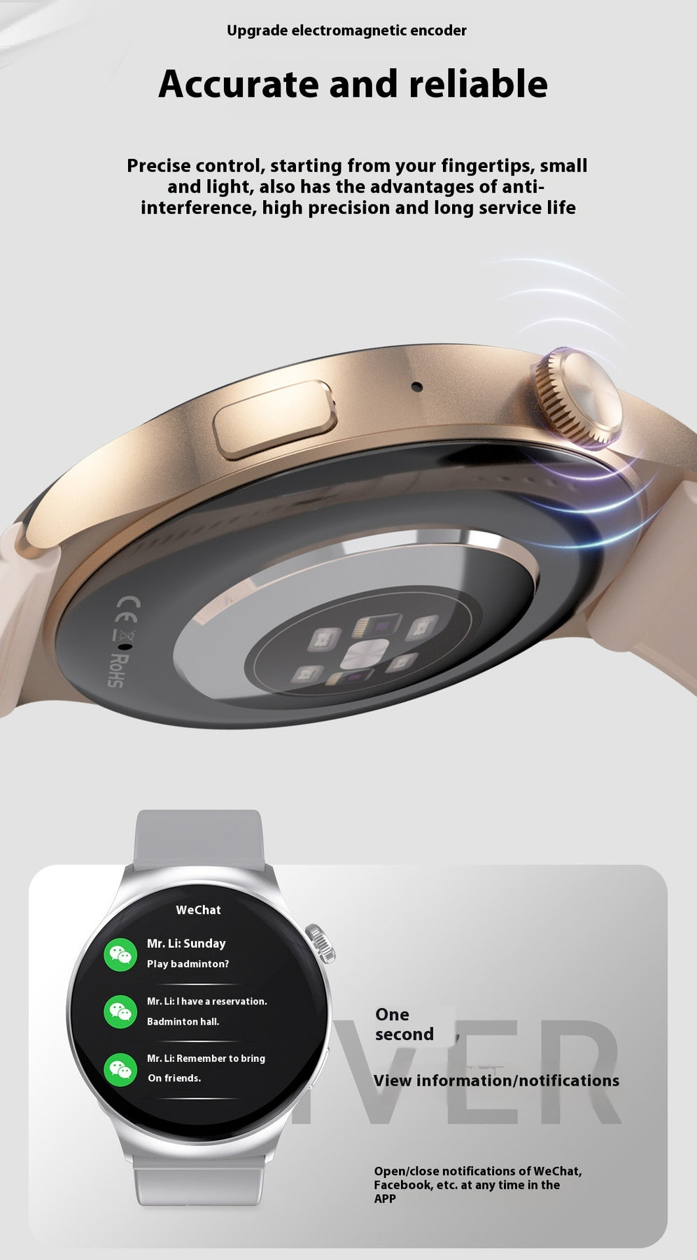 Functions: Waterproof, photographing, step counting, heart rate monitoring, blood pressure measurement, Bluetooth calling, smart reminder, remote control selfie, sleep monitoring, blood oxygen detection